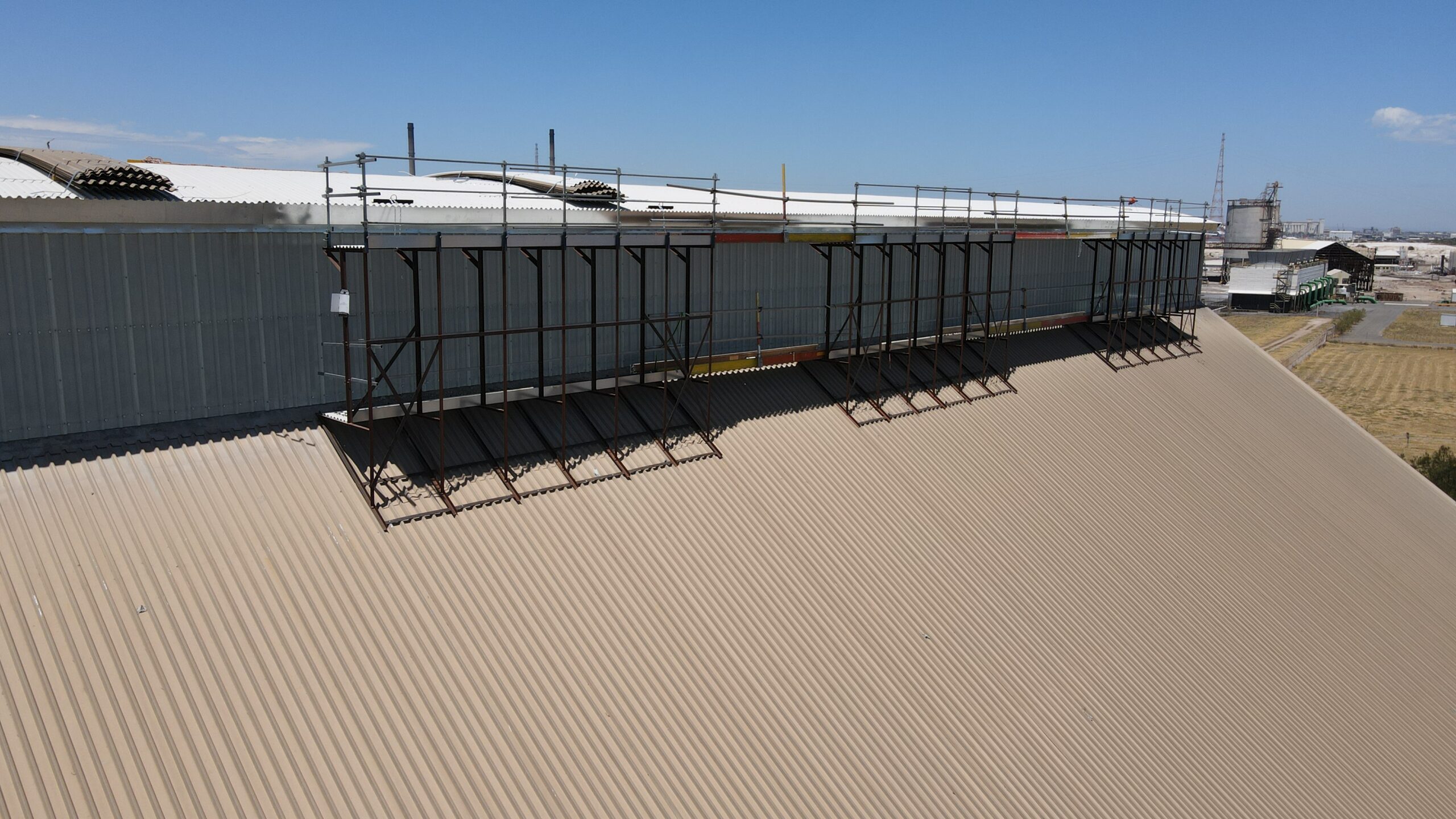 The Cement Australia project was a difficult task to complete safely. Our senior roof project manager Terry Wood along with Tony Hansen from T.V. Hansen Engineering custom designed and fabricated a scaffold to complete task safely. All roof purlins where replaced, Barrel Vault sheeting was replaced using Colorbond Ultra steel and side walls were replaced using Wonderglass GC. The Project was successfully completed within 3 weeks.